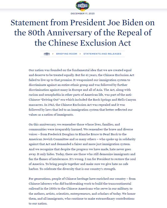 中新網(wǎng)12月18日電 綜合報道,當(dāng)?shù)貢r間17日,美國總統(tǒng)拜登就廢除排華法案80周年發(fā)表文告。美國華人聯(lián)合會(UCA)會長薛海培表示,這是白宮141年來首次正式譴責(zé)排華法案的歷史性文件,這使得華人和亞裔社區(qū)追求平等待遇的歷史性努力又向前邁進了一大步。