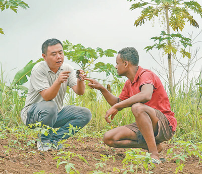 7月15日,在圣多美和普林西比洛巴塔縣卡德拉斯村,中國(guó)援圣普農(nóng)牧業(yè)技術(shù)專家組專家許州達(dá)在田間指導(dǎo)農(nóng)戶努內(nèi)斯種植辣椒。