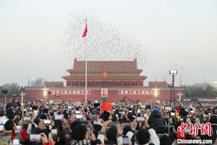 隨著國(guó)旗升至旗桿頂端,萬(wàn)羽和平鴿騰空而起,繞著天安門廣場(chǎng)盤旋。在《歌唱祖國(guó)》的旋律中,“新年快樂(lè)!”“我愛(ài)你,祖國(guó)!”……歡呼聲和掌聲此起彼伏。