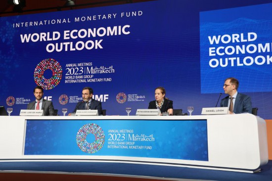 這是2023年10月10日在摩洛哥馬拉喀什拍攝的《世界經(jīng)濟展望報告》發(fā)布會現(xiàn)場。新華社記者霍晶攝
