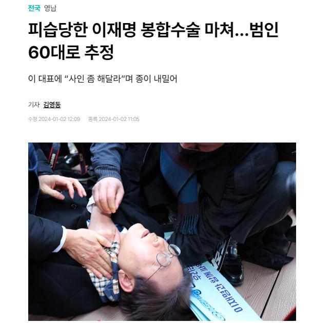 據報道,李在明2日在釜山出席活動時遇襲,頸部左側有約1厘米裂傷,在現(xiàn)場接受緊急止血,隨后送醫(yī)治療。當地時間11點14分左右,李在明接受了縫合手術。