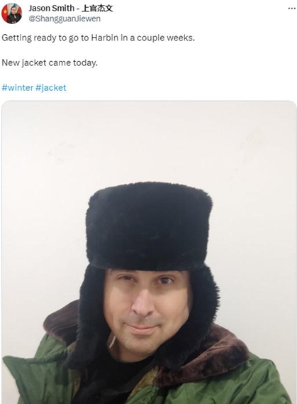 同樣對(duì)哈爾濱充滿興趣的還有美國人上官杰文。他近日在社交媒體上發(fā)布了一張自己頭戴帽子身穿大衣的照片,配文說,“準(zhǔn)備幾周后去哈爾濱。新外套送來了?!?/p>