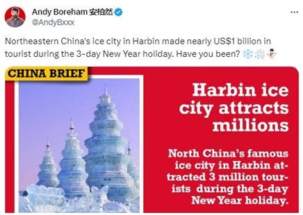 新西蘭媒體人安柏然也在社交媒體上圖文并茂地介紹了哈爾濱的旅游熱潮。對(duì)此,有網(wǎng)友在其帖文下評(píng)論說,“看上去是個(gè)很棒很受歡迎的地方。這絕對(duì)在我的清單上。”