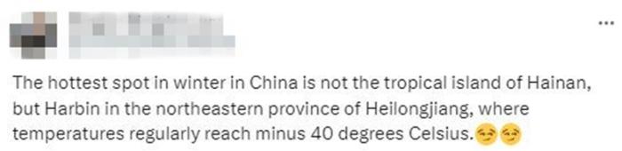 還有網(wǎng)友評(píng)論說,“中國冬天最熱的地方,不是海南島,而是黑龍江哈爾濱,盡管那里的氣溫會(huì)達(dá)到零下40攝氏度?!?/p>