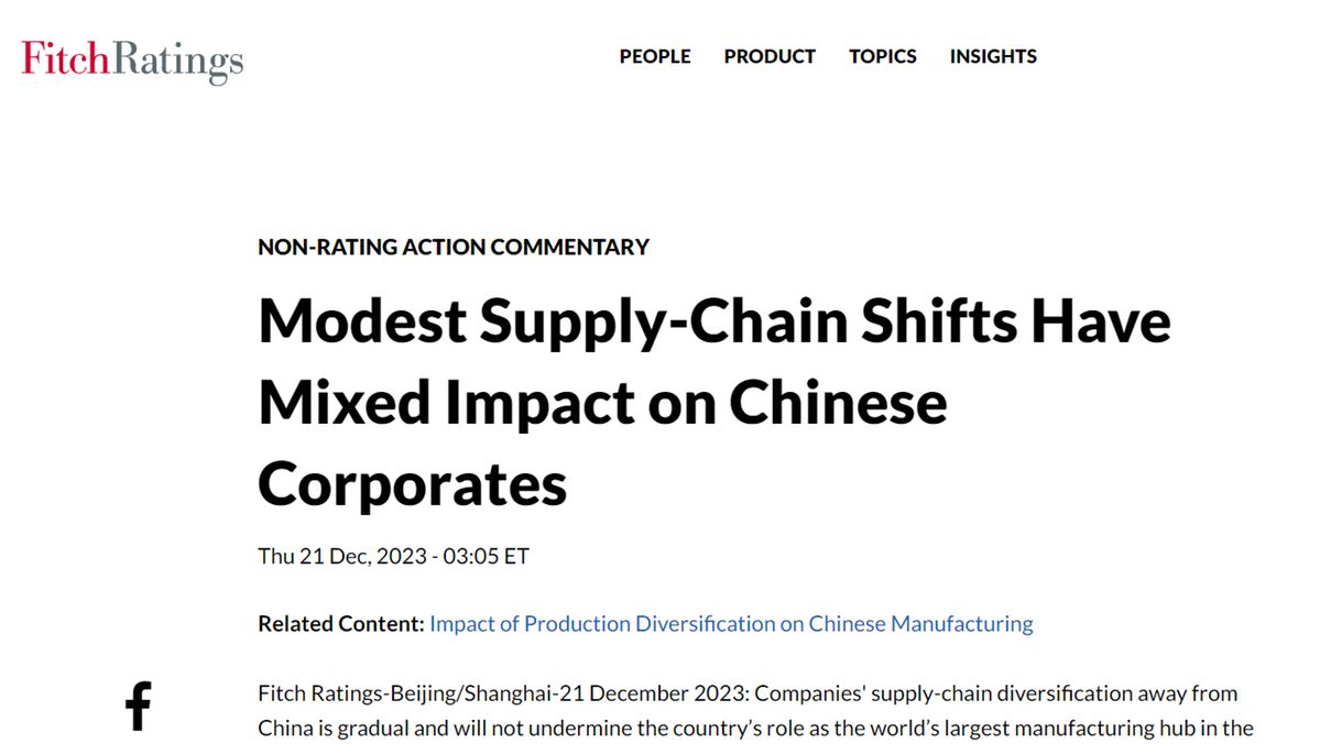 《華爾街日報》的觀察與惠譽評級公司最近的一份報告相呼應。該報告稱,在貿(mào)易壁壘和地緣政治緊張局勢加劇背景下,全球性企業(yè)和中資企業(yè)都在推進供應鏈多元化。不過,產(chǎn)能外遷規(guī)模仍然有限,且集中在低技能的組裝和量產(chǎn)領(lǐng)域,如紡織、服裝和鞋類。