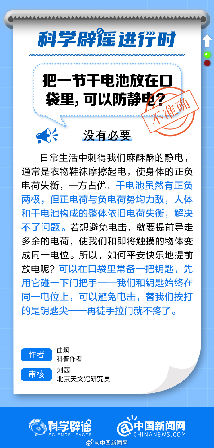 中新網1月11日電 干電池雖然有正負兩極,但正電荷與負電荷勢均力敵,人體和干電池構成的整體依舊電荷失衡,解決不了問題。若想避免電擊,就要提前導走多余的電荷,使我們和即將觸摸的物體變成同一電位。所以,如何平安快樂地提前放電呢? 可以在口袋里常備一把鑰匙,先用它碰一下門把手。(來源:@科學辟謠 中國新聞網)