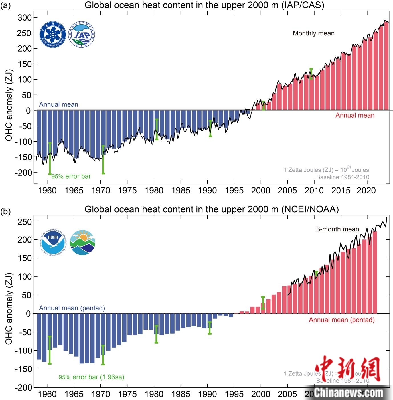 1958-2023年全球海洋上層2000米熱含量變化時間序列:上圖為IAP/CAS數(shù)據(jù);下圖為NOAA/NCEI數(shù)據(jù)。中國科學院大氣物理研究所/供圖