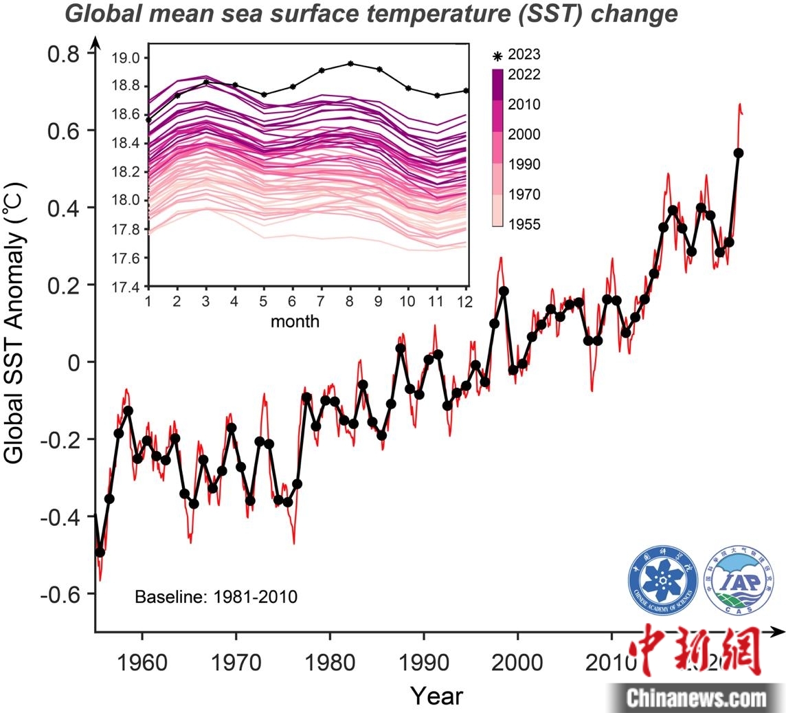 根據(jù)IAP/CAS溫度數(shù)據(jù)產(chǎn)品(1米層)分析的1955年至2023年12月全球平均海表溫度變化。黑線為年均值,紅色為月均值;異常值為相對于1981-2010年常年值;左上角內(nèi)框為海表溫度的季節(jié)變化。中國科學院大氣物理研究所/供圖