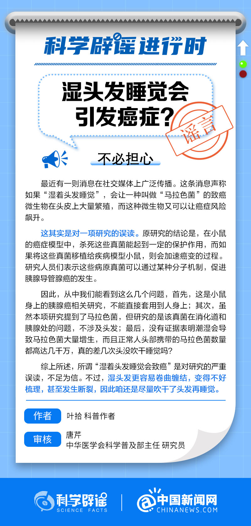 中新網(wǎng)1月15日電 最近有消息稱,如果濕著頭發(fā)睡覺(jué),會(huì)讓一種叫做“馬拉色菌”的致癌微生物在頭皮上大量繁殖,而這種微生物又可以讓癌癥風(fēng)險(xiǎn)飆升。但事實(shí)上,這是對(duì)一項(xiàng)研究的誤讀。不過(guò),濕頭發(fā)更容易卷曲纏結(jié),變得不好梳理,甚至發(fā)生斷裂,大家最好還是盡量吹干了頭發(fā)再睡覺(jué)。詳情↓(來(lái)源:@科學(xué)辟謠 中國(guó)新聞網(wǎng)微博 )