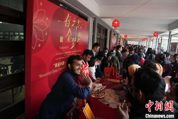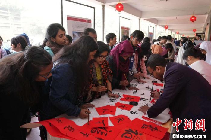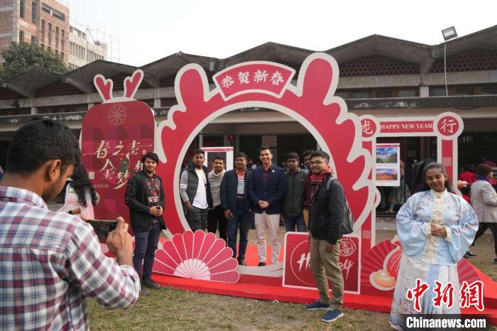 此次活動,受到達(dá)卡大學(xué)師生及當(dāng)?shù)孛癖姷臍g迎。數(shù)百份“福”字、春聯(lián)、年畫、中國結(jié)、燈籠,營造濃濃的節(jié)日氛圍;近3000人次學(xué)生體驗寫福字、穿漢服等傳統(tǒng)文化;精彩的舞獅表演贏得陣陣喝彩;“恭賀新春”打卡區(qū)更是排起長龍……
