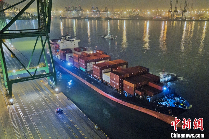 1月16日晚,裝載著2500余噸智利車厘子的大型集裝箱班輪“巴赫”號,順利抵達天津港太平洋國際集裝箱碼頭,標志著天津港與南美洲直航的首條“車厘子快線”正式開通?!败嚴遄涌炀€”始發(fā)于智利圣安東尼奧港,直抵天津港。未來一周,還將有2艘次智利車厘子貨船抵達天津港,累計8300噸車厘子及其他南美洲產品從天津港上岸。(無人機照片) 中新社記者 佟郁 攝