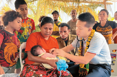 在巴布亞新幾內亞中央省村莊里,第十二批援巴新中國醫(yī)療隊副隊長、新生兒科副主任醫(yī)師劉振球為當?shù)貗雰郝犜\檢查。