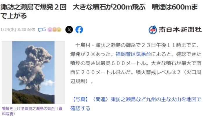 福岡管區(qū)氣象臺發(fā)布消息稱,噴出的煙柱最高達600米,巨大的火山石向外飛出200米。目前,當(dāng)?shù)匾呀?jīng)將火山噴發(fā)警戒提高到2級,火山口周邊區(qū)域禁止入內(nèi)。