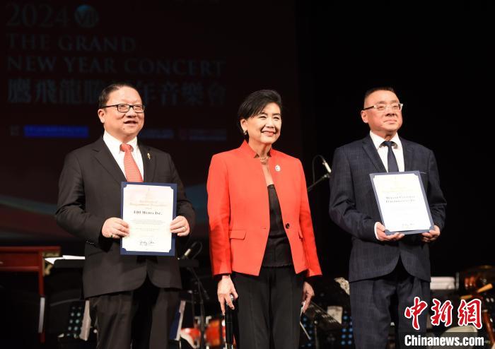 當(dāng)?shù)貢r間1月27日晚,以紀(jì)念中美建交45周年為主題的鷹飛龍騰新年音樂會在美國洛杉磯唱響。圖為美國聯(lián)邦眾議員趙美心(中)向美國鷹龍傳媒董事長蘇彥韜(左)等主辦方代表頒發(fā)賀狀。 中新社記者 張朔 攝