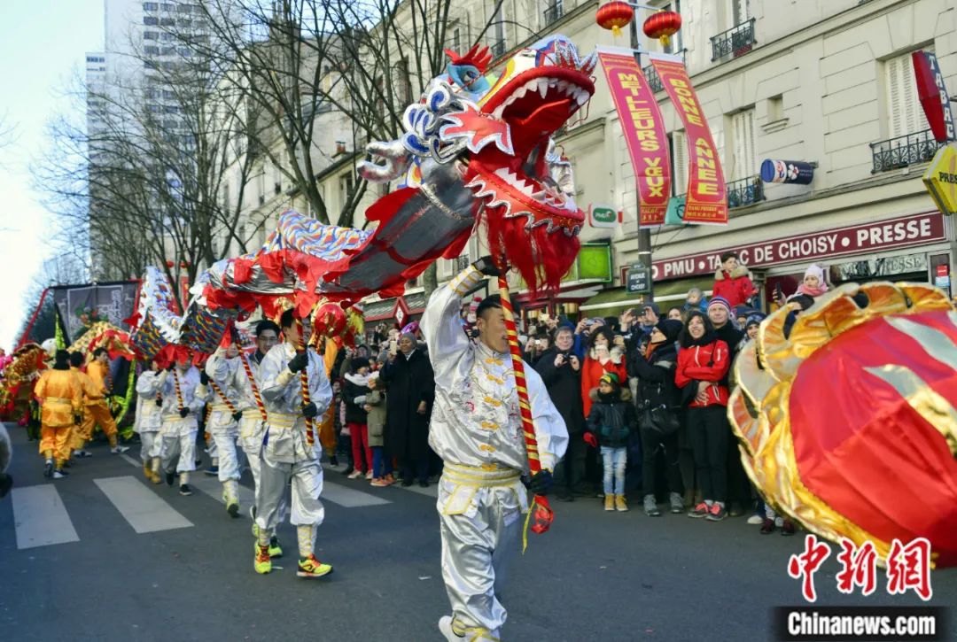 2018年,在法國巴黎十三區(qū)舉行的春節(jié)彩妝游行上,舞龍表演吸引市民圍觀欣賞。龍劍武 攝
