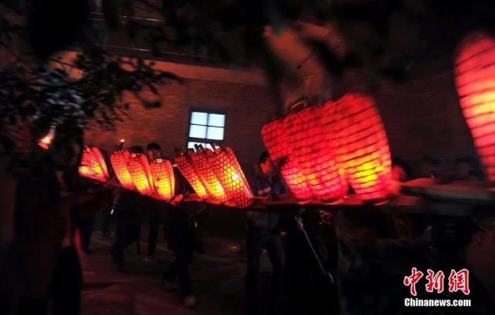 400余條板凳燈連接而成的近800米長的梅燭龍燈繞村游走,夜色中猶如一條巨龍。陳斌 攝