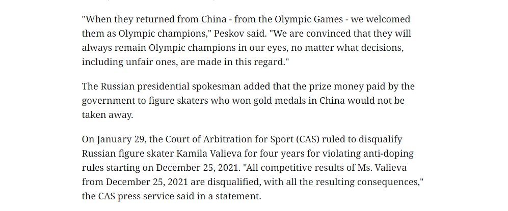中新網(wǎng)1月31日電 近日,國際體育仲裁法庭發(fā)布一則聲明稱,俄羅斯花樣滑冰運動員卡米拉·瓦利耶娃被認定違反了反興奮劑規(guī)則,遭到禁賽四年的處罰,禁賽時間從2021年12月25日起。同時,她自2021年12月25日至今取得的比賽成績也被取消。
