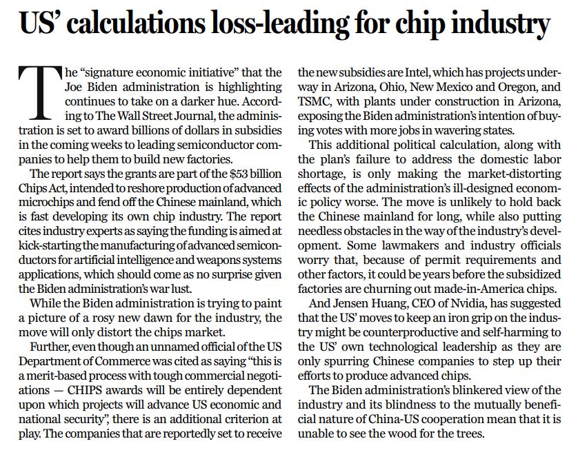 拜登政府此前出臺的《芯片法案》,可為芯片企業(yè)提供總計530億美元的補貼,用以鼓勵先進芯片制造產(chǎn)業(yè)向美國國內(nèi)回流,同時遏制正在快速發(fā)展自主半導(dǎo)體產(chǎn)業(yè)的中國大陸。《華爾街日報》稱,上述建廠補貼,屬于《芯片法案》的一部分。報道還援引行業(yè)專家的觀點表示,這筆資金將為用于人工智能及武器系統(tǒng)的先進半導(dǎo)體的生產(chǎn)提供啟動資金,而基于拜登政府對戰(zhàn)爭的狂熱,此舉不足為奇。