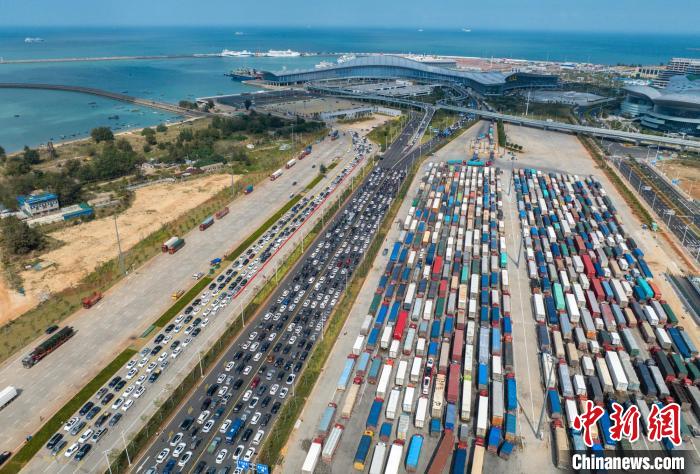 2月5日海口新海港,等待出島的車輛被分流為小車和貨車。中新網(wǎng)記者駱云飛攝