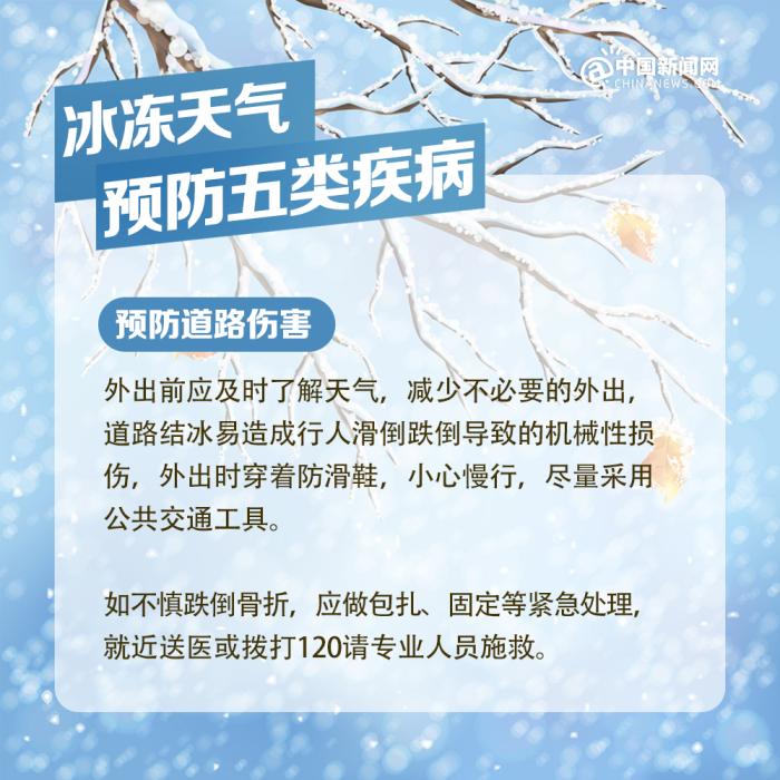 中新網(wǎng)北京2月7日電 近期我國中東部地區(qū)出現(xiàn)大范圍持續(xù)性低溫雨雪冰凍天氣過程,局部地區(qū)累計(jì)降雪量將接近或超過歷史同期,雨雪覆蓋范圍廣、持續(xù)時(shí)間長、凍雨范圍大,雨雪冰凍災(zāi)害風(fēng)險(xiǎn)高,恰逢春節(jié)人員大規(guī)模流動,以下健康防護(hù)要點(diǎn)請查收。