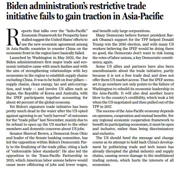 如今美國的一些盟友及伙伴也開始對IPEF失去了熱情,部分原因在于該框架并非自由貿(mào)易協(xié)定,也沒有提供給他們進入美國市場的機會。IPEF似乎已經(jīng)是“窮途末路”,它的處境,映證的是美國在重塑亞太地區(qū)經(jīng)濟領(lǐng)導(dǎo)力方面的失敗,也令美國自2017年退出TPP后再次“信譽掃地”。