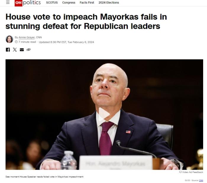 中新網(wǎng)2月7日電 綜合美媒報道,當(dāng)?shù)貢r間6日,美國國會眾議院以214票對216票的表決結(jié)果,未能通過對美國國土安全部長馬約卡斯的彈劾案。