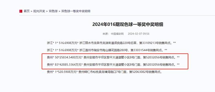 記者致電貴州省福利彩票發(fā)行中心,相關(guān)工作人員表示,在貴州的134注一等獎中,133注為同一銷售網(wǎng)點銷售,由兩張彩票組成。銷售網(wǎng)點的地址為貴州安順市平壩區(qū)黎平大道堡墅小區(qū)8號門面,編號為第52032056號。
