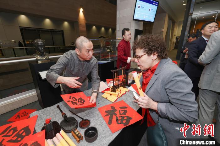 當(dāng)?shù)貢r(shí)間2月6日晚,加拿大蒙特利爾,中國(guó)駐蒙特利爾總領(lǐng)館與中國(guó)常駐國(guó)際民航組織理事會(huì)代表處在國(guó)際民航組織(ICAO)總部聯(lián)合舉辦“共慶春節(jié)”主題活動(dòng)。圖為當(dāng)?shù)厝A人書法家(左)向與會(huì)嘉賓講解以中國(guó)書法書寫的“?!弊??!≈行律缬浾? 余瑞冬 攝