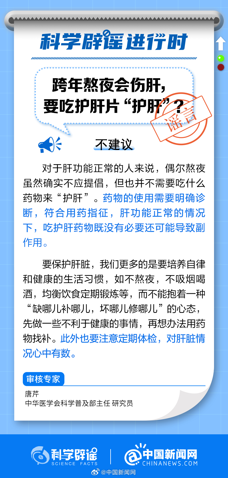 中新網(wǎng)2月10日電 對于肝功能正常的人來說,偶爾熬夜不需要吃什么藥物來“護肝”。藥物的使用需要明確診斷,符合用藥指征,肝功能正常的情況下,吃護肝藥物既沒有必要還可能導(dǎo)致副作用。要保護肝臟,我們更多的是要培養(yǎng)自律和健康的生活習慣,如不熬夜、不吸煙喝酒、均衡飲食、定期鍛煉等。(來源:@科學辟謠 中國新聞網(wǎng)微博)