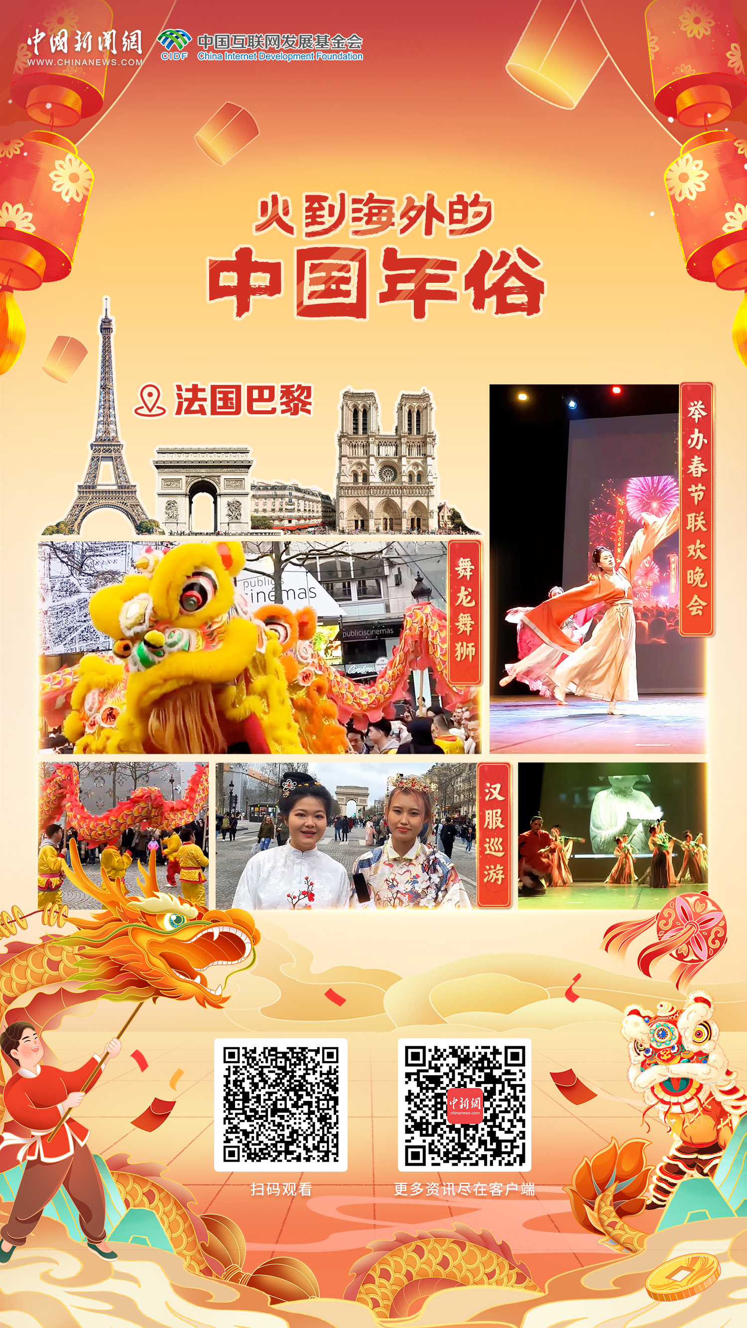 2024年恰逢中法建交60周年,也是中法文化旅游年。中國龍年春節(jié)之際,“龍獅賀歲舞香街”春節(jié)活動在法國巴黎香榭麗舍大街舉行。期間,舞龍、舞獅、漢服巡游、青田魚燈舞等表演吸引游客目光。