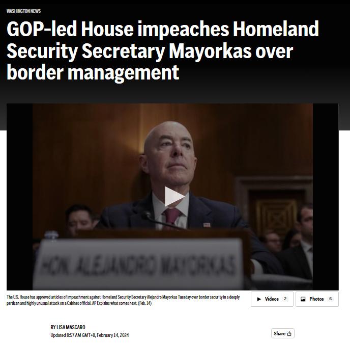 中新網2月14日電 綜合美媒報道,當地時間13日,美國眾議院批準了針對邊境安全問題對國土安全部長馬約卡斯的彈劾條款,使他成為自1876年以來首位被眾議院彈劾的內閣部長。
