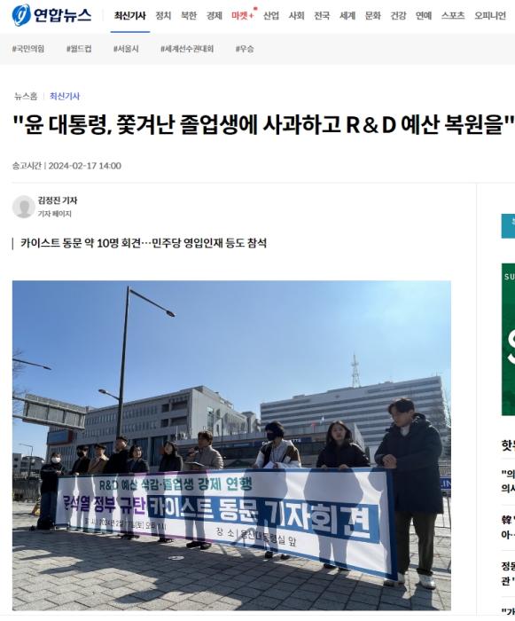 17日,韓國(guó)科學(xué)技術(shù)研究院的校友在龍山總統(tǒng)府前舉行記者會(huì),他們表示:“尹錫悅總統(tǒng)毫不留情地堵住畢業(yè)生的嘴,并將其趕了出去,對(duì)此我們感到非常憤怒?!彼麄円笠a悅道歉,并恢復(fù)削減的研究與開發(fā)預(yù)算。