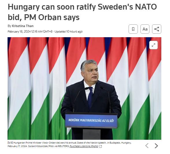 中新網(wǎng)2月18日電 據(jù)路透社報(bào)道,當(dāng)?shù)貢r(shí)間17日,匈牙利總理歐爾班·維克托在一次演講中表示,匈牙利議會(huì)可能在2月晚些時(shí)候召開(kāi)的春季會(huì)議上,批準(zhǔn)瑞典加入北約。
