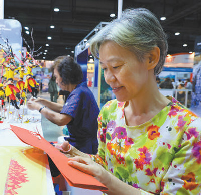 1月25日,在泰國國際旅游展上,參觀者體驗(yàn)中國剪紙。