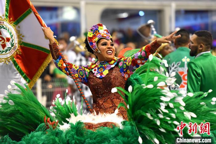 當?shù)貢r間2月17日晚間,巴西圣保羅狂歡節(jié)冠軍隊重返桑巴大道做收官游行演出,圖為一名桑巴舞校的演員在起舞。記者林春茵攝