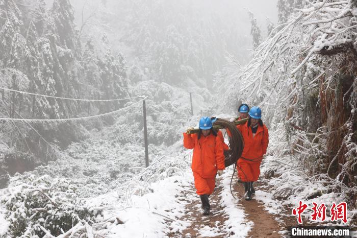 2月8日,國網(wǎng)浙江電力援湘搶險隊員前往平江縣開展搶修作業(yè),扛運搶修物資。 李聞文 攝
