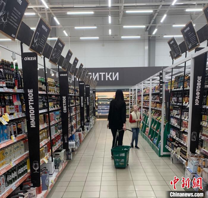 2023年10月,俄羅斯圣彼得堡一超市內(nèi)的酒類(lèi)銷(xiāo)售區(qū)?!≈行律缬浾?商永 攝