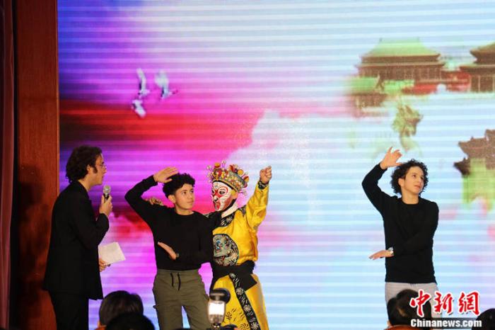 戲曲名段表演、法語經(jīng)典歌曲串燒……你方唱罷我登場,中法青年在文藝表演中秀出各自的文化風(fēng)采。由中國戲曲學(xué)院學(xué)生代表帶來的民族器樂演奏、經(jīng)典戲曲名段聯(lián)唱獲得了臺(tái)下的陣陣喝彩。在京劇片段《大鬧天宮》表演結(jié)束后,法國少年受邀與孫悟空扮演者互動(dòng)。