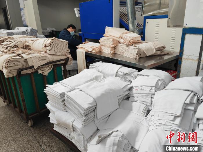 臥具從工業(yè)洗衣機(jī)里撈出后,就進(jìn)入烘干、消毒、熨燙工序,從進(jìn)入烘干機(jī)到再從熨燙機(jī)出來,只需10秒,原本滴水的臥具就變得干燥平展。這對(duì)負(fù)責(zé)折疊、打包的洗滌工手速有著極高的要求。