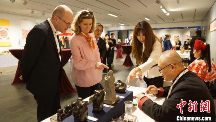 來賓欣賞石雕非遺手工藝。柏林中國文化中心供圖