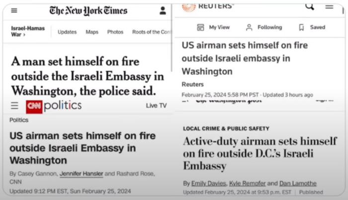 正常一則報道,標題最好是能以最高效的方式聚合“時間地點人物起因經(jīng)過結(jié)果”諸要素(因為是“新聞”,時間要素反而可以選擇弱化),而在西方主流媒體對這次自焚抗議事件的第一批報道中,標題基本都只有“地點人物結(jié)果”三個要素,即《某人在以色列使館自焚》這樣的表達,最多會加一個“空軍”或“現(xiàn)役空軍”的人物身份。