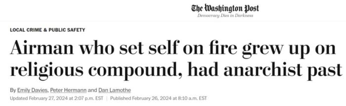 2月25日在以色列駐美大使館門前自焚身亡以抗議美以在加沙進行種族滅絕的25歲現(xiàn)役美空軍亞倫·布什內(nèi)爾,以身證道,成了近期震驚世界的事件。關(guān)于這位義士的生平簡介、抗議行動本身和以后的價值、意義,這兩天想必各位也聽了、看了不少了,今天烏鴉來談談這次自焚抗議事件發(fā)生后,也許更加值得細品的一些狀況。
