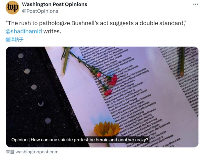 后一篇中提及了很多中文媒體中提到的對布什內(nèi)爾和“阿拉伯之春”自焚事件的“雙標”問題,看起來是為布什內(nèi)爾說話了。好了,看起來郵報這是公平公正,讓正反方辯手都上場辯論,各顯其能。