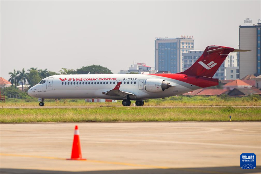 這是3月4日在老撾萬象瓦岱國際機(jī)場拍攝的ARJ21飛機(jī)。新華社發(fā)(凱喬攝)