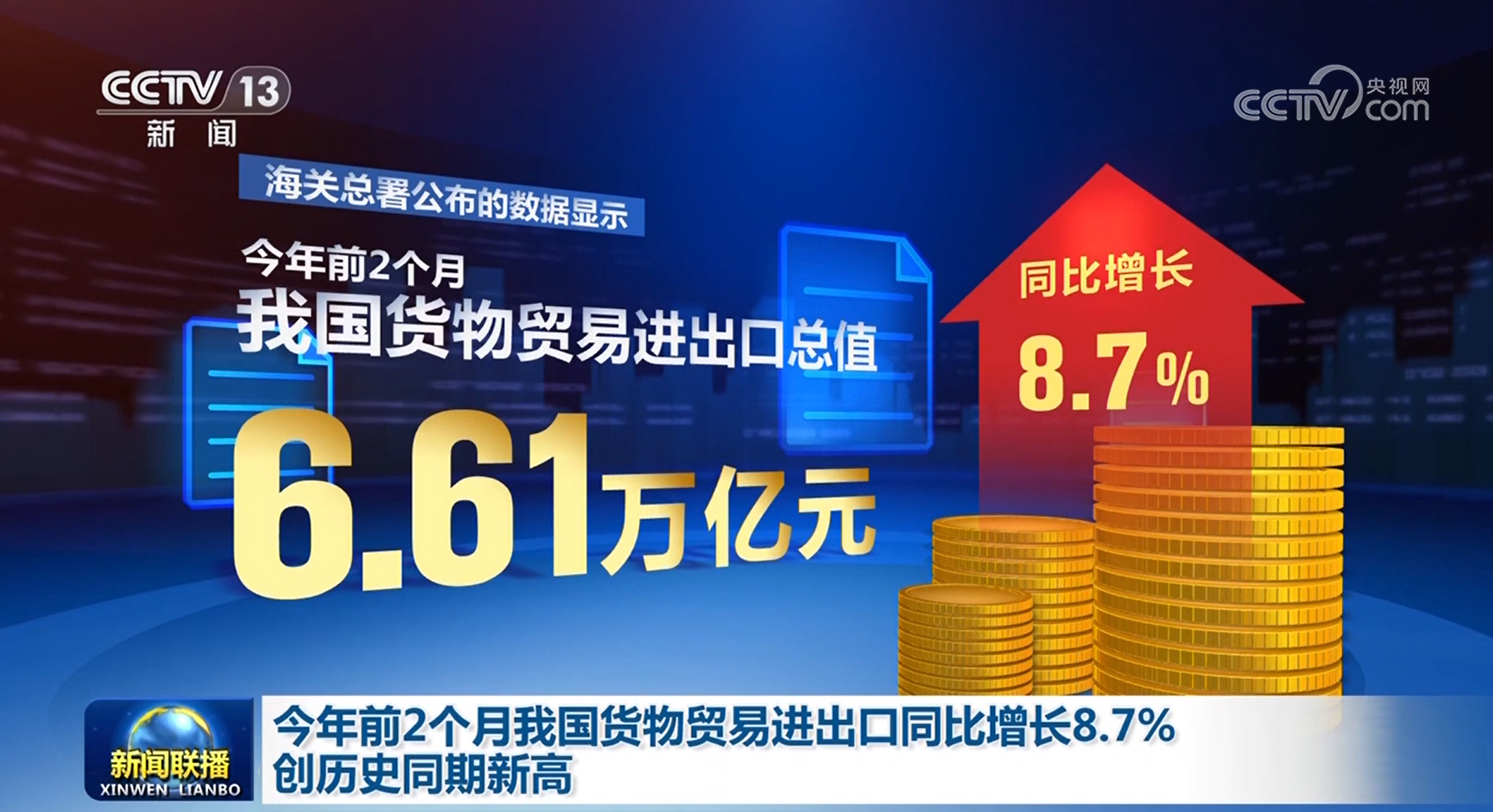 央視網(wǎng)消息(新聞聯(lián)播):記者今天(3月7日)從海關(guān)總署獲悉,今年前2個月,我國貨物貿(mào)易進出口規(guī)模創(chuàng)歷史同期新高,外貿(mào)實現(xiàn)良好開局。