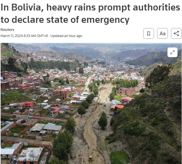 據(jù)此前報(bào)道,自3月開始,拉巴斯遭遇持續(xù)降雨,山體滑坡、洪水、泥石流等自然災(zāi)害多發(fā)。官方數(shù)據(jù)顯示,自1月雨季開始以來(lái),玻利維亞全國(guó)各地已有近50人死于洪水。