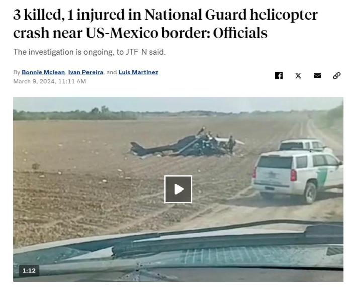 據(jù)報道,這架直升機負責執(zhí)行聯(lián)邦西南邊境支援任務,于當?shù)貢r間8日下午2時50分左右在得克薩斯州里奧格蘭德市附近執(zhí)行任務時墜毀。