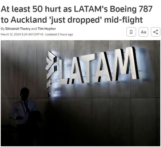 當(dāng)時, 總部位于智利的拉塔姆航空公司一架從澳大利亞悉尼飛往新西蘭奧克蘭的波音飛機(jī),因技術(shù)問題,在飛行途中急降,“劇烈俯沖”數(shù)秒,導(dǎo)致乘客撞上機(jī)艙頂,造成至少50人受傷。