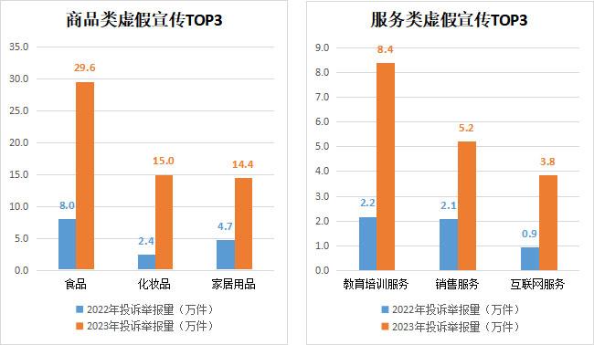 消費(fèi)者在購物時(shí)會接觸到各種各樣的宣傳信息,但海量的宣傳信息并非都是真實(shí)可信的,一些商家以夸大其詞、隱瞞真相等手段,誘使消費(fèi)者做出錯(cuò)誤的消費(fèi)選擇。2023年,全國12315平臺接收虛假宣傳投訴舉報(bào)144.3萬件,同比增長1.7倍。從商品服務(wù)類別來看,商品類別中虛假宣傳投訴舉報(bào)較多的有食品(29.6萬件)、化妝品(15萬件)、家居用品(14.4萬件);服務(wù)類別中虛假宣傳投訴舉報(bào)較多的有教育培訓(xùn)服務(wù)(8.4萬件)、銷售服務(wù)(5.2萬件)、互聯(lián)網(wǎng)服務(wù)(3.8萬件)。消費(fèi)者反映的問題主要集中在商家虛構(gòu)產(chǎn)品效果、夸大產(chǎn)品優(yōu)勢,通過“好評返現(xiàn)”提高虛假聲譽(yù),誤導(dǎo)消費(fèi)者購買等。