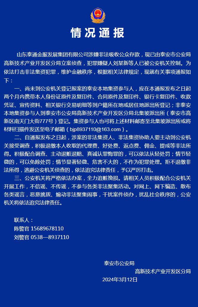 中新網(wǎng)3月13日電 山東泰安高新警方12日在官方微信公眾號發(fā)布山東泰通金服發(fā)展集團有限公司涉嫌非法吸收公眾存款的情況通報,目前該案件已由泰安市公安局高新技術(shù)產(chǎn)業(yè)開發(fā)區(qū)分局立案偵查,犯罪嫌疑人劉某新等人已被公安機關(guān)控制。為依法打擊非法集資犯罪,維護金融秩序,根據(jù)相關(guān)法律規(guī)定,現(xiàn)就有關(guān)事項通報如下: